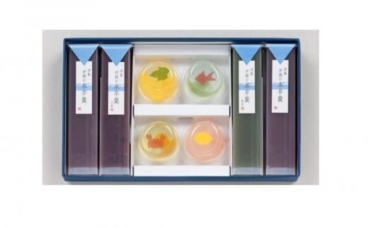 ・涼の晴風 金魚(りんご)、朝顔(甘夏)、レモン、カニ(マスカット)各1 ・涼菓伊織の水羊羹(こし×2、抹茶×1、小倉×1) 170×290×45mm |