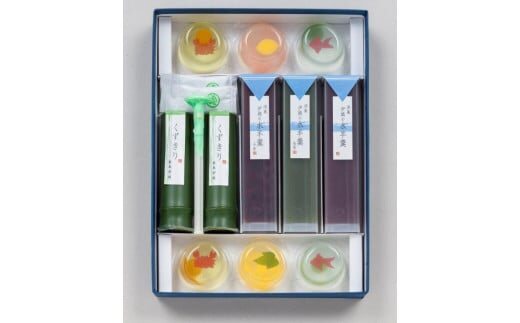 ・涼の晴風 金魚(りんご)・カニ(マスカット)各2、朝顔(甘夏)・レモン各1 ・涼菓伊織の水羊羹(こし、抹茶、小倉) 各1 ・くずきり×2 290×220×45mm |