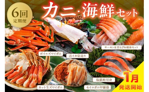 【定期便6回/1月発送】店主厳選!おすすめカニ・海鮮セット(カット生ズワイガニ4肩・ボイルズワイガニ4肩・セイコガニ甲羅盛3個・銀鮭切り身約1kg・サーモン&甘えびお刺身セット・活イカ姿造り200g前後)海鮮 定期便 カニ 定期便 海鮮 頒布会 YK00255