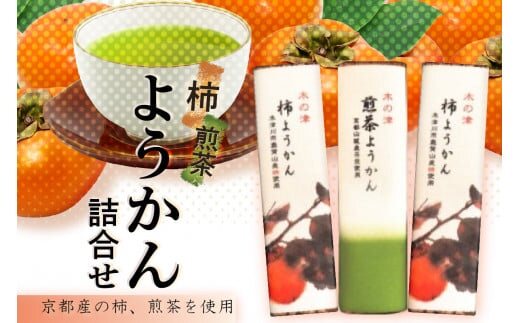 鹿背山産の柿と、京都山城産の煎茶を使用して作られた、柿ようかん(2本)と煎茶ようかん(1本)の詰合せです。