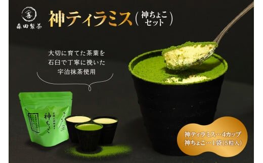 森田製茶の石臼挽き宇治抹茶をまろやかなマスカルポーネチーズと合わせたティラミスと濃厚な宇治抹茶チョコレート『神ちょこ』とのセット商品。