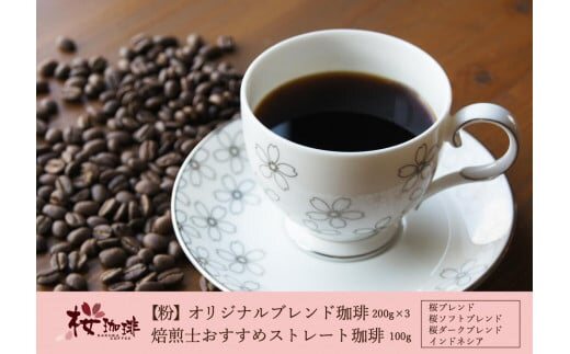 【桜珈琲】オリジナルブレンド珈琲200g×3種 & 焙煎士おすすめストレート珈琲 インドネシア100g(粉)