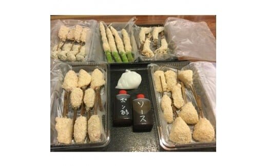 枚方市駅前サンプラザビルの店舗で、串ネタ約30種の中から枚方の皆様に好評を頂いている8種類の串カツをお届けいたします。