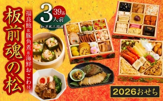 おせち「板前魂の松」和洋風 三段重 39品 3人前 6.8寸 鮑&おこわ&豚角煮 付き【おせち料理 板前魂 贅沢おせち お節 惣菜 冷凍 先行予約 年内発送 おせち料理2026】