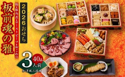 おせち「板前魂の雅」和洋風 三段重 40品 3人前 6.8寸 鮑&おこわ&豚角煮&ローストビーフ 付き【おせち料理 板前魂 贅沢おせち お節 惣菜 冷凍 先行予約 年内発送 おせち料理2026】