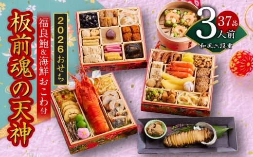 おせち「板前魂の天神」和風 三段重 6.8寸 37品 3人前 福良鮑&海鮮箱入りおこわ 付き【おせち料理 板前魂 贅沢おせち お節 惣菜 冷凍 先行予約 年内発送 おせち料理2026】