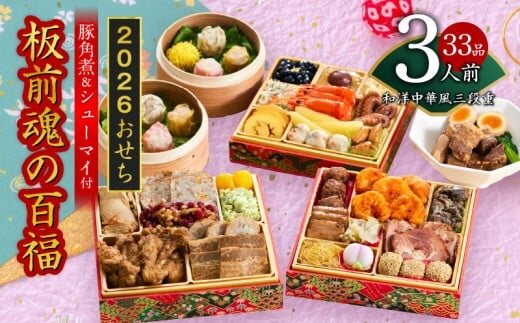 おせち「板前魂の百福」和洋中華風 三段重 33品 3人前 6.8寸 豚角煮&焼売4種 付き【おせち料理 板前魂 贅沢おせち お節 惣菜 冷凍 先行予約 年内発送 おせち料理2026】