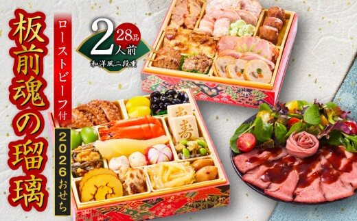 おせち「板前魂の瑠璃」和洋風 二段重 28品 2人前 6.8寸 ローストビーフ 付き【おせち料理 板前魂 贅沢おせち お節 惣菜 冷凍 先行予約 年内発送 おせち料理2026】