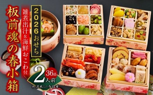 おせち「板前魂の春小箱」和洋風 ミニ与段重 36品 2人前 4.8寸 雑煮出汁&おこわ 付き【おせち料理 板前魂 贅沢おせち お節 惣菜 冷凍 先行予約 年内発送 おせち料理2026】