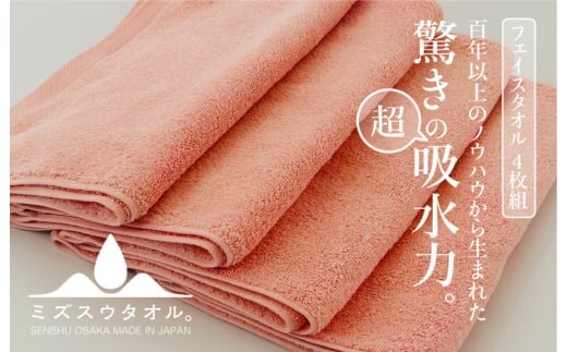 【驚きの吸水力】ミズスウタオル フェイスタオル 4枚 ピンク【スピード発送 泉州タオル 国産 吸水 普段使い シンプル 日用品 家族 ファミリー】