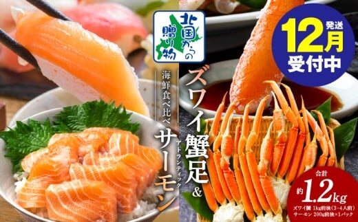 【年内発送】ズワイガニ足 1kg 3-4Lサイズ 蟹酢付 昆布塩加工 & アトランティックサーモン 200g 海鮮食べ比べセット【北国からの贈り物】