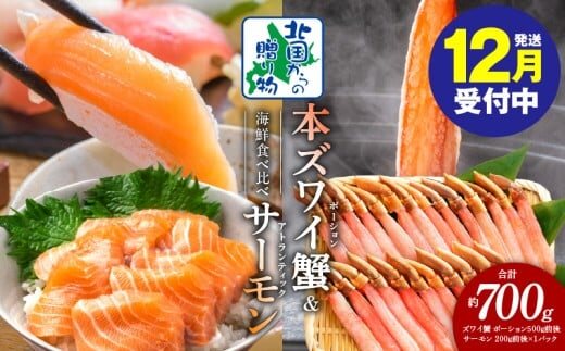 【年内発送】本ズワイガニ ポーション 500g 生食可 蟹酢付 & アトランティックサーモン 200g 海鮮 食べ比べセット【北国からの贈り物】