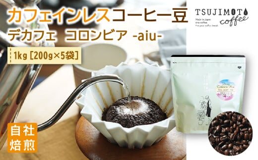 コーヒー カフェインレス 自家焙煎 デカフェコロンビア aiu 1kg(200g×5袋)豆のまま【1502849】