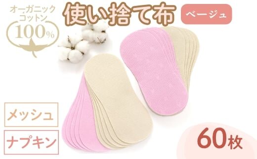 オーガニックコットン100%使い捨て布(ナプキン×メッシュ×60枚×ベージュ) 【m90-11-B】【しるばあ衣料研究開発】