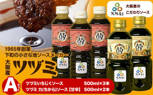 ツヅミ ソース 大阪産 Aセット2種 500ml×計5本《30日以内に出荷予定(土日祝除く)》大阪府 羽曳野市 濃厚ソース とんかつソース 焼きそばソース ウスターソース 揚げ物 たこ焼き 送料無料 ソース 調味料
