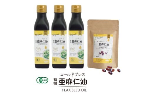 コールドプレス 有機亜麻仁油(アマニ油)185g×3本<化粧箱入>・カプセルになった亜麻仁油 60粒【1548777】