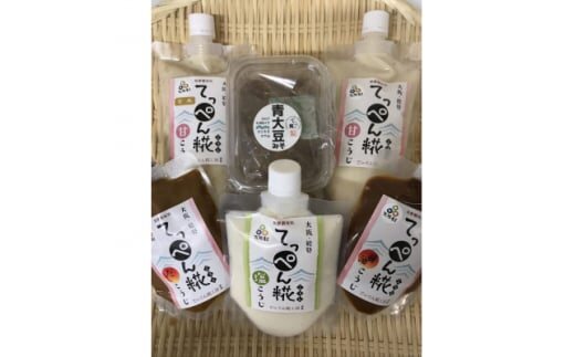 今回は、そんな甘こうじ(2種類)、塩こうじ、だしこうじ、醤油こうじ、そして青大豆みそ自慢の6点セットでお届けします。