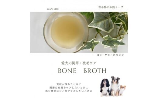 ボーンブロスとは、骨のだしを抽出したスープで、骨にはアミノ酸やコラーゲン、ミネラル、ビタミンなどが豊富に含まれます。じっくり煮出すことで、骨の栄養素がスープに溶け出しました。腸に良いといわれるグルタミン・グリシン、美しい被毛や皮膚に必要なコラーゲン、健康な関節に不可欠なグルコサミンやコンドロイチン硫酸、ヒアルロン酸などが含まれ、体の調節や健康維持に役立ちます。