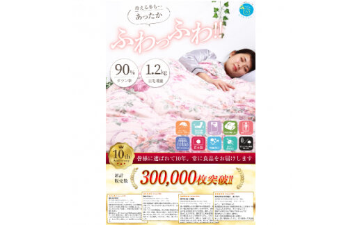 シルバーダウン90% かさ高135mm。1.2kg入り。側生地は綿15% ポリエステル85% 国内洗浄を行い、パワーアップ加工を施しております。その為、しっかりとした衛生加工で、より安心して、より快適にご利用いただけます。生地にも風合いと丈夫さを重視し、とても肌触りの良い生地を使用いたしております。時間をかけて羽毛に優しいパワーアップ加工を施しておりますので、とてもふっくらとした羽毛に仕上がり、より快適にご使用いただけます。 ムラ無く全体的に均一な暖かさを保ち、からだにフィットしやすいキルトです。 カバー固定用ループ8ヵ所付きです。