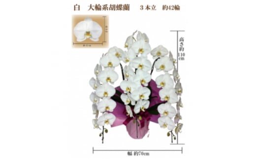 ■お礼品の内容について ・御供 胡蝶蘭 白大輪3本立 42輪 ラッピングカラー(紫)[1点] 原産地:東南アジア/加工地:大阪府 岬町 ■原材料・成分 高さ:約110cm 横幅:約70cm(生花につき若干の個体差があります) |