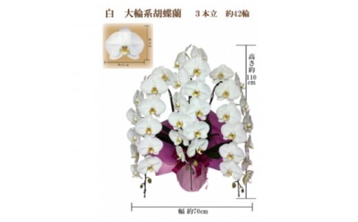 ■お礼品の内容について ・御祝 胡蝶蘭 白大輪3本立 42輪 ラッピングカラー(ピンク)[1点] 原産地:東南アジア/加工地:大阪府 岬町 ■原材料・成分 高さ:約110cm 横幅:約70m(生花につき若干の個体差があります) |