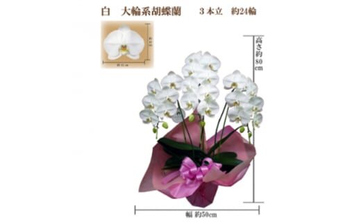 ■お礼品の内容について ・御供 胡蝶蘭 白大輪3本立 24輪 ラッピングカラー(紫)[1点] 原産地:東南アジア/加工地:大阪府 岬町 ■原材料・成分 高さ:約80cm 横幅:約50cm(生花につき若干の個体差があります) |