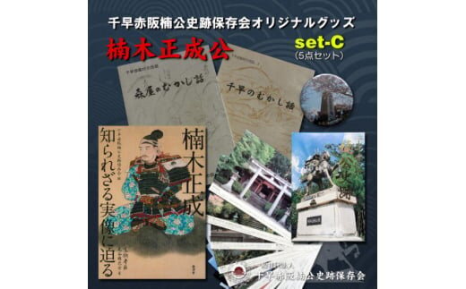千早赤阪村出身の南北朝の武将「楠木正成公」の生き様に迫る書籍「楠木正成~知られざる実像に迫る~」と千早赤阪村のむかし話2冊に、奉建塔や棚田など村の景観の缶バッジ1つと、楠公史跡の絵はがきセットを加えた5点セットです。