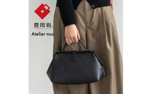 開口部にアルミフレームを入れたのショルダー付きのダレスバッグ。