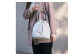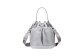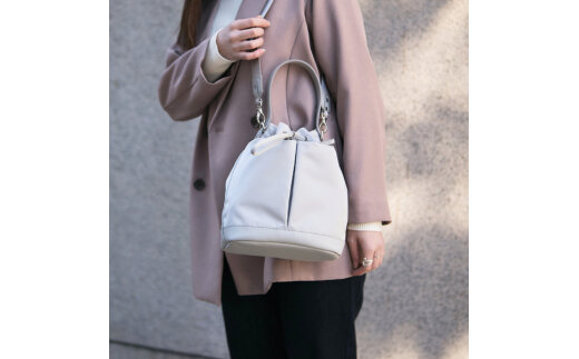 巾着型2WAY BAG(ショルダーバッグ・手提げバッグ)です。 本体素材の上品な艶と付属の牛革カラーを組み合わせることで、よりエレガントな印象を引き立たせました。カラーはシルバーグレーと、若い女性に人気のブラックの2色展開です。TUTUMUでは珍しく、アイレットなど多くの金具を使用しているのも印象的です。シルバーグレーにはシルバー色(ニッケルメッキ)、ブラックにはブラックシルバー色(ブラックニッケルメッキ)を施しました。 日常使いにちょうど良い大きさのショルダーベルト付き手提げバッグです。