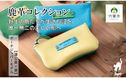 AN3 鹿革コレクション【蒲公英×翠】ポーチジッパーモデル 【 鹿革 革製品 ポーチ 小物入れ 小銭入れ カードサイズ オーガニック 手作り たんぽぽ タンポポ 黄色 イエロー 翠 みどり 緑 グリーン 】