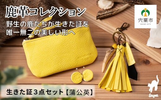 AN15 鹿革コレクション「生きた証」蒲公英 3点セット 【 ポーチ タッセル チャーム 鹿革 革製品 小物入れ 小銭入れ カードサイズ オーガニック 蝶 チョウ 手作り タンポポ たんぽぽ 黄色 イエロー 】