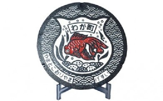 本物のマンホール鉄蓋を1/3.5に縮小した観賞用ミニチュアマンホール鉄蓋「ミニチュアグラウンドマンホール」です。大和郡山市のデザインは、「わが町」の文字と共に金魚鉢で気持良さそうに泳ぐ金魚が描かれています。本物を製造しているメーカーが、本物と同じ材料・工程を用い、1点1点職人による手作業で製造しております。