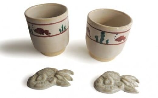 今日の赤膚焼は西の京五条山郡山に窯があって、二楽の窯もそのひとつ。小川二楽の祖は、もと江州信楽窯小川谷の出身、京に上って清水焼を究め、その子が五条山に移り、さらに郡山の只今の地に窯をひらいて二楽と号し、多くの方々に認められました。二楽の赤膚焼は素朴な中に無限の雅味をたたえた特異な作風、おおらかな大和の郷愁が多くの人の心を惹く作品です。1点1点ロクロで作るオンリーワンの作品です。湯呑はやさしい風合いで白い釉薬をかけていますので、お茶の緑がよく映えます。大和郡山市は江戸時代から金魚の養殖が盛んで、全国金魚すくい選手権大会も開催しています。金魚絵の湯呑と金魚型の箸置で食卓が楽しくなります。