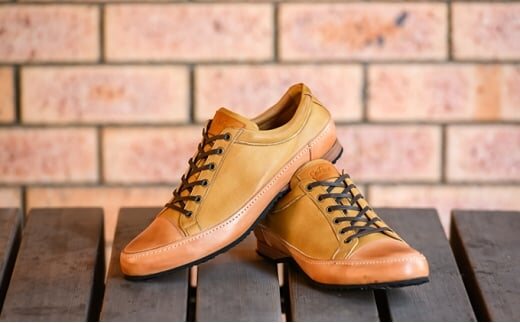 ソールは高性能なビブラムソールでアッパーは吸湿性、通気性が良くとても柔らかな鹿革を使用し、履き心地とデザイン性を兼ね備えたハイクオリテイーなタウンカジュアルシューズ。しかも鹿革は奈良県宇陀市で鞣されたものを使用し、製造は奈良県大和郡山市というメードイン奈良の逸品。サイズの目安はスニーカーのサイズから0.5cm~1cm下、革靴のサイズからは表示サイズ相応。ワイズは3E相当。