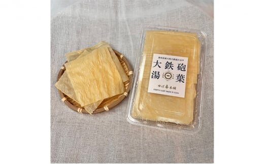 豆腐伝来の地と云われる奈良に、戦前から伝わる幻の大豆「大鉄砲」。その名の通り「大きな粒」と「甘み」が特徴の奈良県在来大豆です。地元農家の鎌田ファームさんと私たち豆腐屋で種を探し、一緒に種を蒔き復活させた貴重な大豆です。2020年2月に奈良県で守るという意味を込めて「大和大鉄砲」という名称で商標登録を致しました。「こんなおいしい大豆を豆腐だけに使うのはもったいない」私たち三木食品のそんな想いから醤油、味噌、きな粉、そしてこの「大鉄砲湯葉」が生まれました。しぼりたての新鮮な大鉄砲豆乳を木枠で囲った大きな平鍋に入れ、じっくり弱火で加熱する。ゆっくりゆっくりとできる美しい膜、これこそが「大鉄砲湯葉」です。製造元であるゆば喜本舗では、この「膜」を一枚一枚手作業で長い割竹を使い静かに引き上げ、水切りをし乾燥させるといった伝統的な製法を今も守り続けています。大和大鉄砲大豆の甘みそして旨み、更には栄養素が凝縮された上品で贅沢な一枚をどうぞご賞味ください。