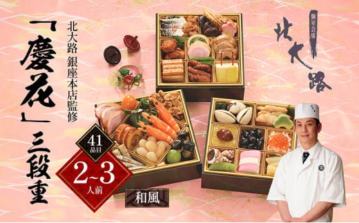 北大路 銀座本店監修「慶花」三段重 (3段重・2人前~3人前・41品目・和風おせち)【 おせち お正月 お祝い 】[№5990-0791]