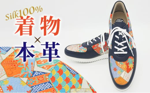着物シューズ 着物スニーカー 本革 日本製 ユニセックス メンズ レディース 紐 レースアップ 牛革 高級正絹着物を靴にアップサイクル ネイビー No.1851E2701 24.0cm [№5990-6726]0834