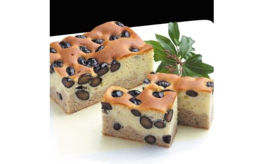 「鞆渕黒大豆」を2日かけ仕込み、表面や生地に粒ごとふんだんにあしらっているほか、二層に分かれた生地にもペーストして混ぜ込んだ、手作りの優しさと黒豆本来の甘さが楽しめるパウンドケーキです。