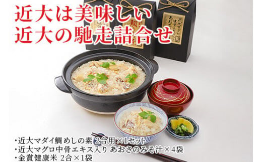 近畿大学の研究成果が反映された「近大マダイ鯛めしの素」「近大マグロ中骨エキス入り あおさのみそ汁」「金賞健康米」の3つの商品を詰合せにしたギフトセットです。