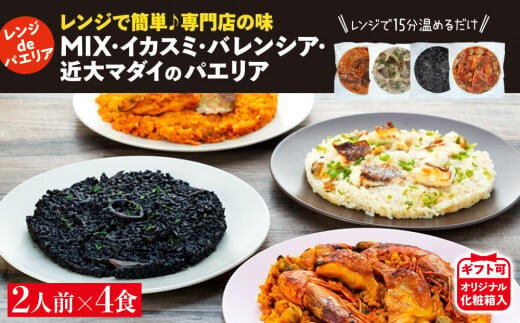 【レンジdeパエリア】2人前×4食(MIXパエリア・イカスミのパエリア・バレンシアのパエリア・近大マダイのパエリア)レンジで簡単♪専門店の味【ギフト可】オリジナル化粧箱入