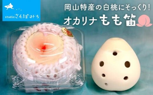 もも笛(ももぶえ)は2020年に岡山で誕生した新しいオカリナです。岡山県民でさえ本物の白桃と見間違える出来で、どなたでも簡単に音が出せて、少し練習すれば「桃太郎」のメロディーを吹くことができます。吹いて楽しく、飾ってかわいく、贈ってびっくりの岡山らしいオカリナです。どんな年代の方にも喜ばれるプレゼントとしても人気です。桃太郎以外の楽譜もついていて、吹き方説明動画もご用意しています。「行列のできる相談所」に出演し明石家さんまさんに褒めていただきました。もも笛の売り上げの一部は岡山の河川清掃活動費として使われます。