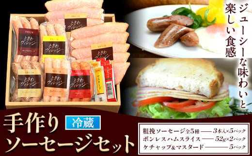 【粗挽きソーセージ】(プレーン・スモーク・レモン・ガーリーックペッパー・チョリソー)各88g(3本入)×5パック 【ボンレスハムスライス】52g×2パック 【ケチャップ&マスタード】6.5g×5パック |