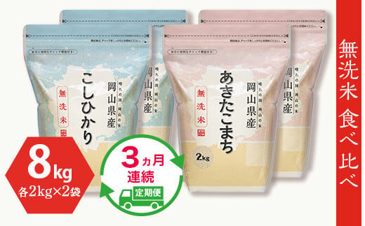 【無洗米】食べ比べ8kg(こしひかり2kg×2袋、あきたこまち2kg×2袋)【3ヶ月連続お届け】