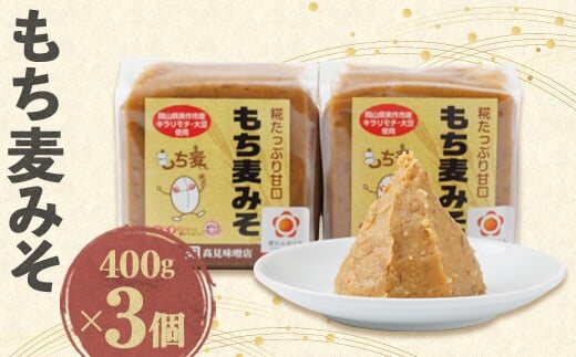■内容量/製造地 もち麦みそ400g×3個 製造地:岡山県美作市 ■原材料:お礼品に記載 ※アレルギー物質などの表示につきましては、お礼品に記載しています。 |