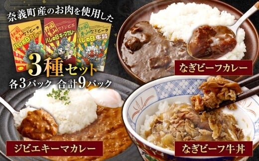 なぎビーフ牛丼・カレー・ジビエカレー3種セット 各3パック 計9パック レトルトカレー カレーライス キーマカレー 牛丼 鹿 鹿肉 惣菜 おかず 和牛 黒毛和牛 なぎ 国産 岡山県 奈義町