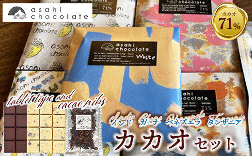 インド・ガーナ・ベネズエラ・タンザニアの豆を使ったタブレットチョコレート4種セットに加え、ホワイトチョコレートにカカオニブを混ぜこんだチョコレート、トーストやアイスにトッピングしてお楽しみいただけるカカオニブ1袋が入ったカカオセットです。