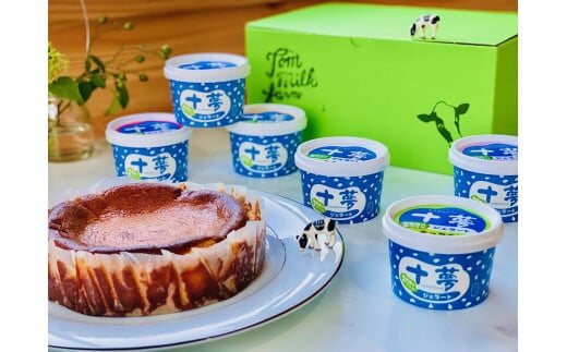 牧場の低温殺菌牛乳を使用したジェラートの詰合せと今話題のバスクチーズケーキの詰合せです。ジェラートは一番人気の十夢みるく、いちご、抹茶、地元産のかぼちゃ、豊栄りんごの詰合せです。バスクチーズケーキは、レアチーズとベイクドチーズの良いところを兼ね備えたちょっと大人のスイーツです。おやつに、デザートに、贈り物に、皆様でお召し上がりください。