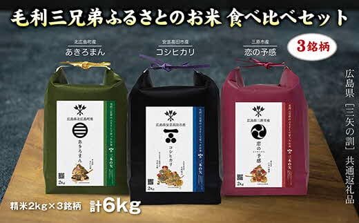 [№5895-0757]【三矢の訓共通返礼品】毛利三兄弟ふるさとのお米 食べ比べセット 2kg×3セット 安芸高田市産コシヒカリ 北広島町産あきろまん 三原市産恋の予感