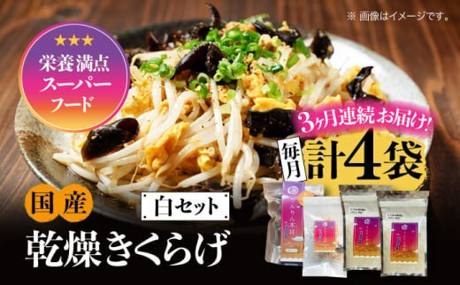 【全3回定期便】【栄養満点のスーパーフード!りんりんきくらげ】国産 乾燥 木耳 美容 健康 白セット 計4袋 きくらげ キクラゲ 木耳 きのこ キノコ 食品 食物繊維 野菜 やさい ビタミンD 乾燥 炒め物 ラーメン 便利 密封 安心 安全 美容 健康 腸活 ギフト 国産 広島県産 人気 江田島市/株式会社凛[XCB018]