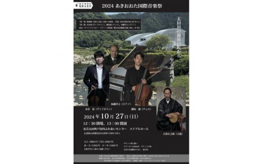 ■お礼品の内容について ・2024あきおおた国際音楽祭 入場券チケット(大人)[1枚] サービス提供地:広島県安芸太田町 ■提供サービス 世界で活躍されている素晴らしい音楽家が勢揃いした音楽祭。 当日は地元加計高校の生徒が皆様をお迎えします。 自由席ですが、当日約2時間前から整理券をお渡しします。早めにお出かけくださり、 河原や自然の中でゆっくりとお楽しみください。当日はいろいろなお店が出店する予定です。 ※寄付お申し込み受付後、チケットを送付いたします。 ※チケットは必ずお持ちください。ご持参なしの場合、事由に関わらずサービスのご提供が出来ません。(規定の料金をご請求させて頂きます。) ※チケットは期限迄に必ずご利用ください。期日を過ぎたチケットはご利用頂けません。 ※チケットの払戻等は出来ません。 ■生産者の声 音楽祭に来てくださった方からのアンケートに書かれた感想文の一部を記載 〇本物のクラシックのコンサートを、地元で、ベヒシュタインのご縁で、聴く事ができて良かった。 〇1部で乾いた心に水がまかれ、2部の1曲目で元気になり、その後、水が涙となった。 〇会場・観客と一体となった生の演奏はすばらしいですね。アンプラグドはいい。加計高生すばらしい。 〇音楽ってすばらしい!! 心がふるえる貴重な時間をいただき、大感激です。 〇こんな場所でこんなに素晴らしいトリオの演奏が聴けるなんて思っても見ませんでした。とんでもなく、凄い事です。 〇加藤さんのピアノがすごくよかった。感動しました。横坂さんのチェロは圧巻でした。遠方から来て良かったです。また来たいです。 〇お二人から曲の解説を聞けたのがとても良かったです。曲の背景はもちろん、穏やかなお人柄が伝わってきました。素晴らしい会に参加できて感謝です。 〇Bechsteinの響き、哀愁ただよう演奏。某テレビ番組で横坂源さんのBachの2番を聴いて、生の音が聴きたいと思って探し偶然にも広島でののこの音楽祭を知りました。感動しました。 ■注意事項/その他 未就学生の入場はお断りしています。 |